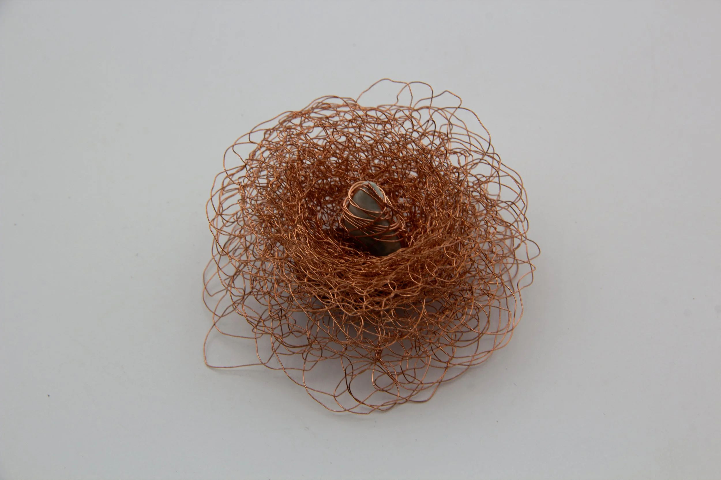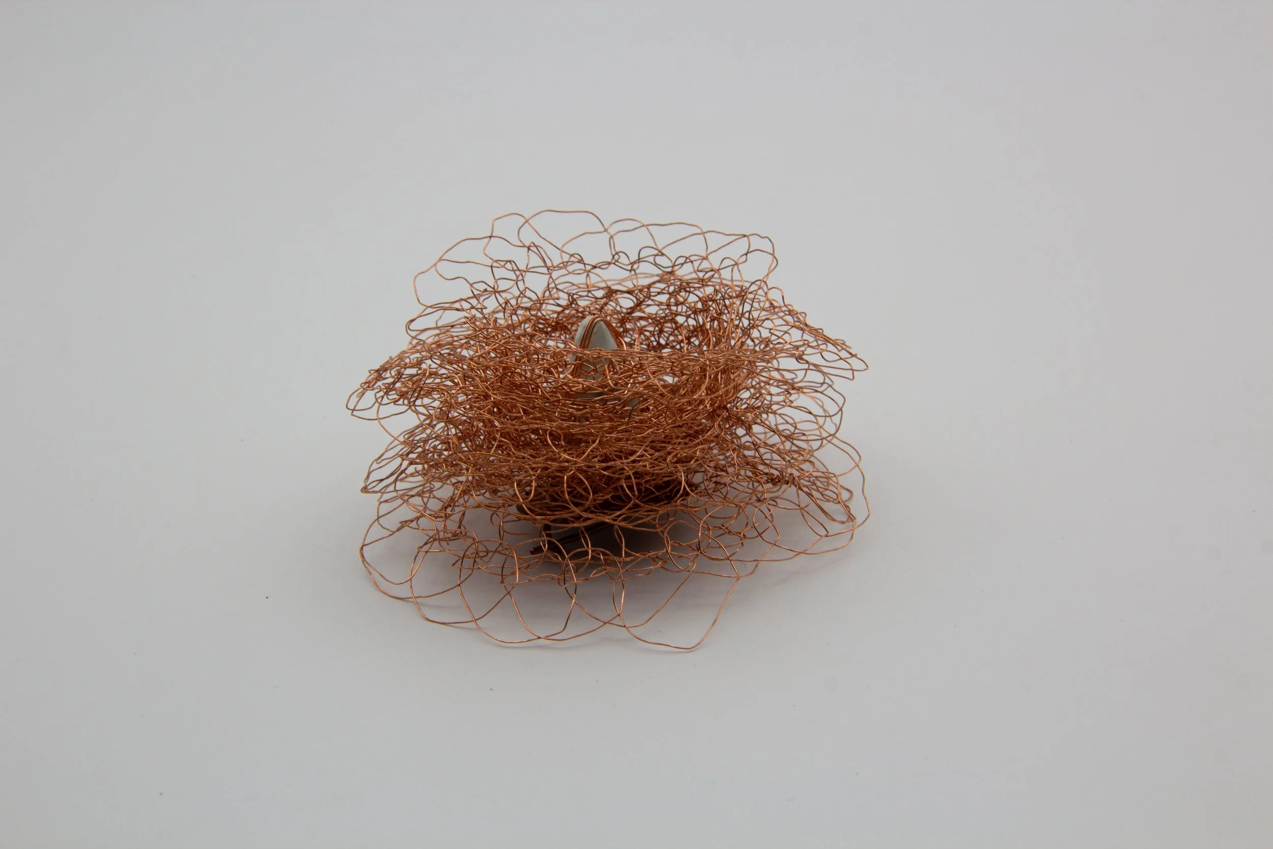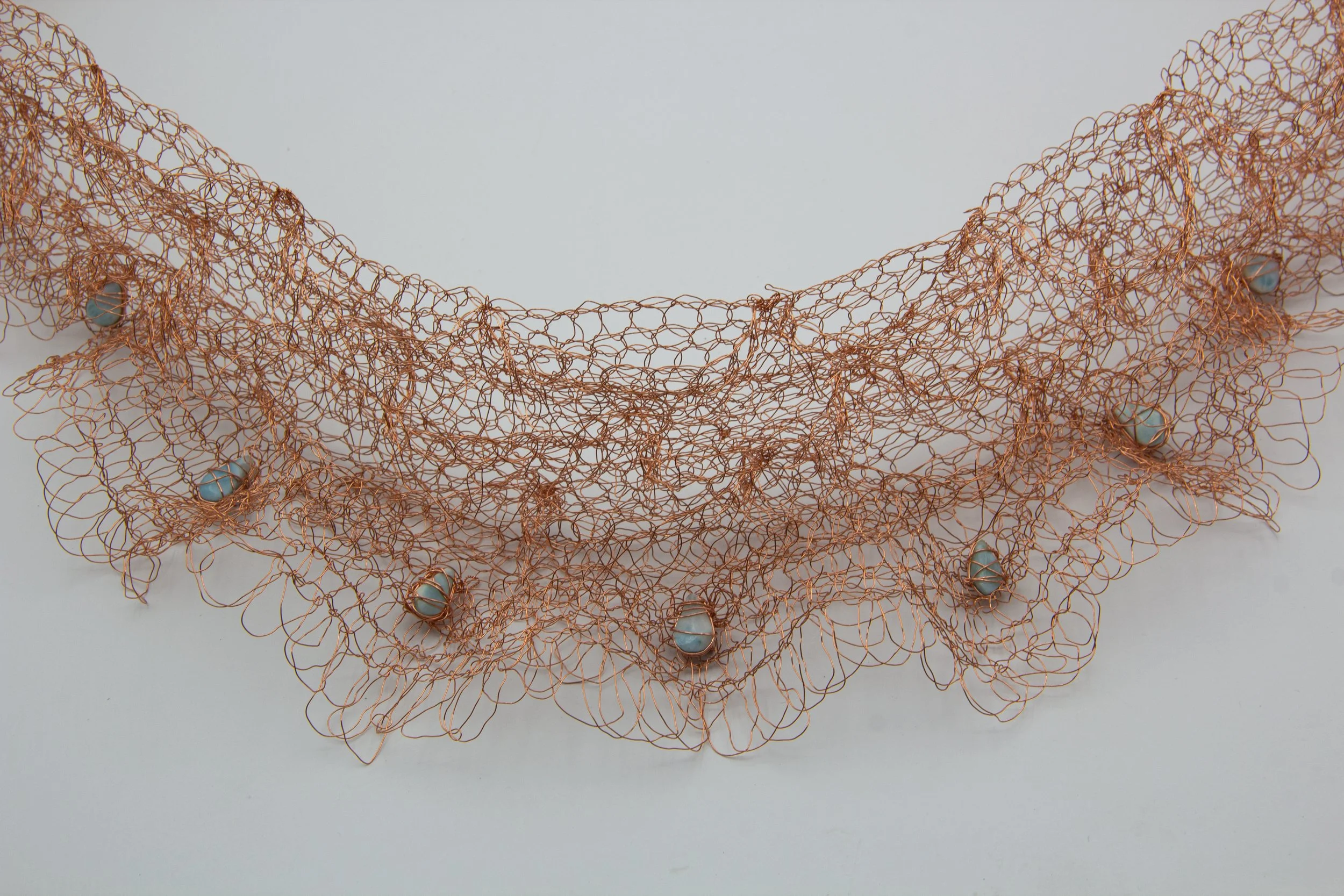This pieces are hand crafted with the crochet technique from copper wire and adorned with Larimar stones sourced from the Dominican Republic. The ruffled silhouette echoes traditional Dominican festive garments, celebrating my heritage. The copper beautifully
